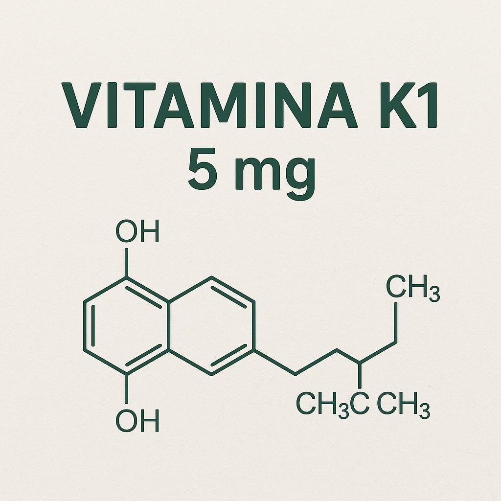 A Vitamina K1 5 mg, também chamada fitomenadiona, é a forma sintética da vitamina K natural, essencial para a coagulação sanguínea adequada. Essa vitamina lipossolúvel participa na síntese dos fatores de coagulação II, VII, IX e X e atua como cofator na carboxilação pós-transdutiva dos precursores desses fatores. Ela é rapidamente absorvida pelo intestino na presença de bile e, uma vez absorvida, é transportada para o fígado, onde é totalmente aproveitada sem acumular no organismo. Também atravessa a placenta e passa para o leite materno, contribuindo para a proteção do recém-nascido.
